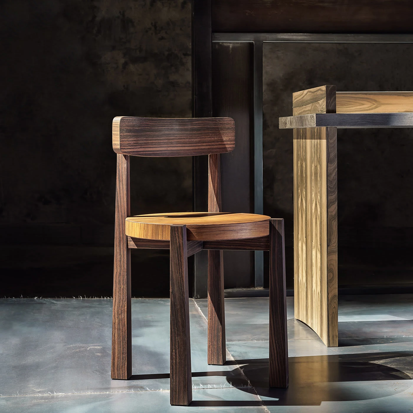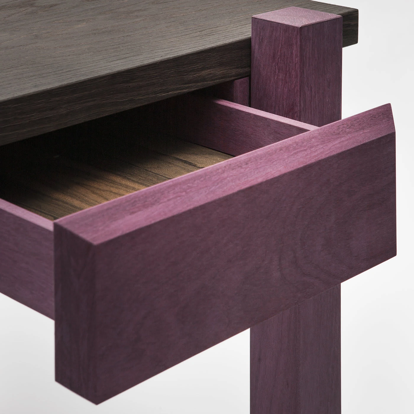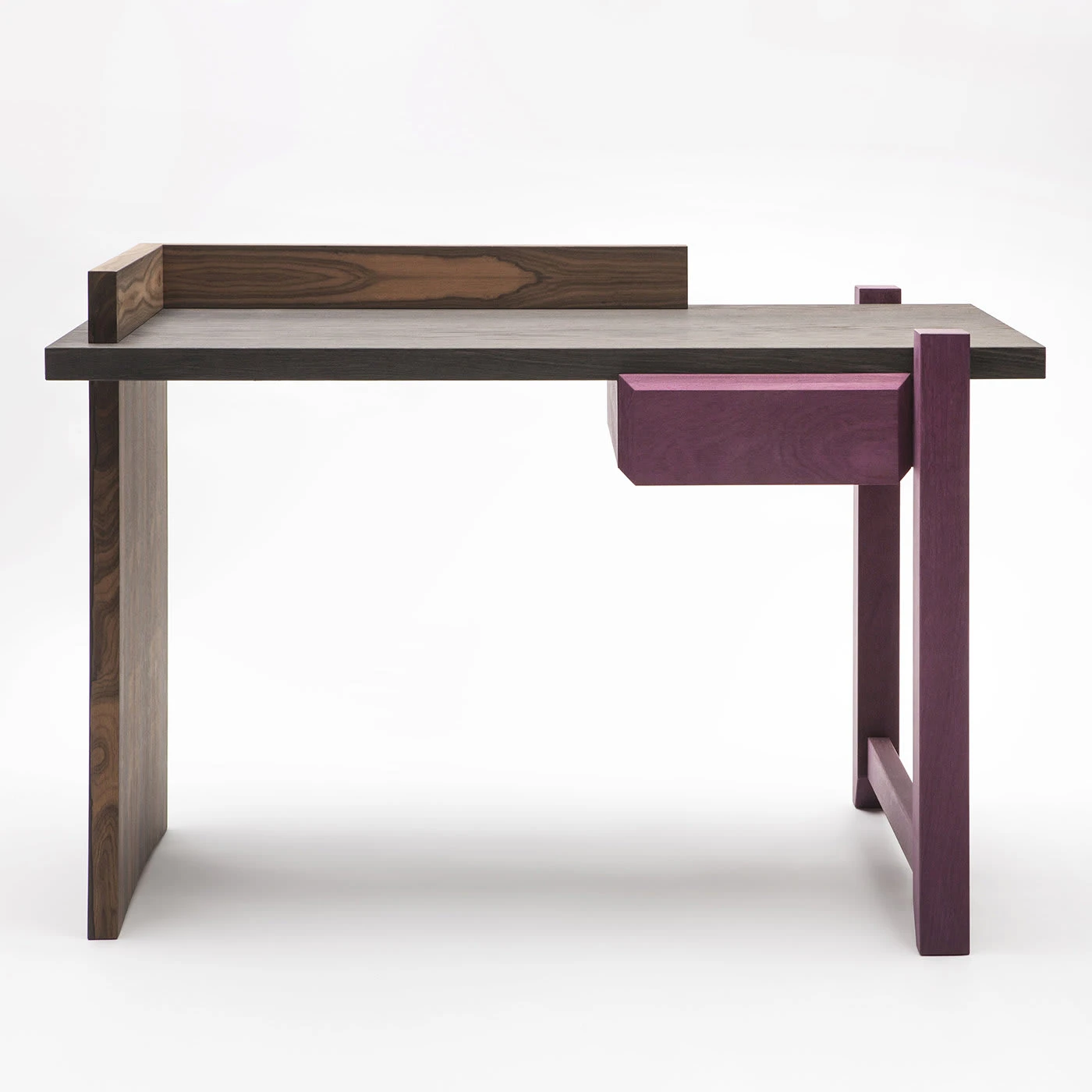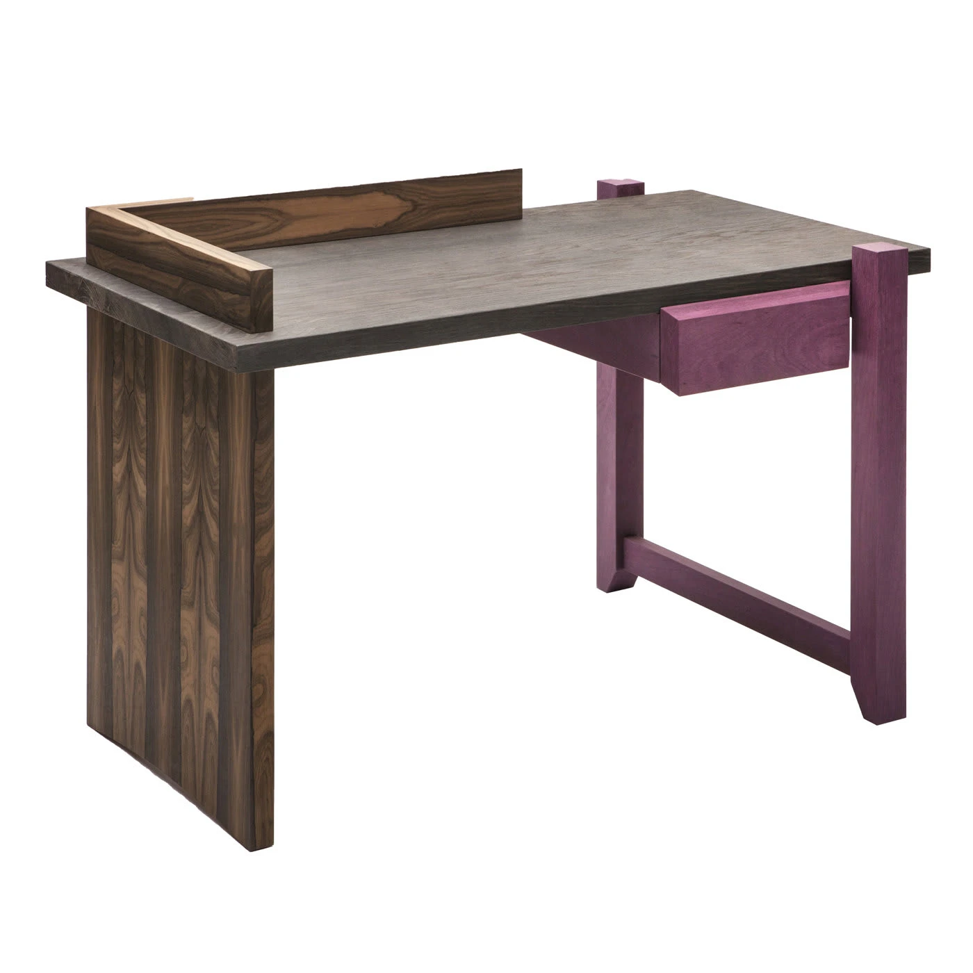An exquisite combination of masterful traditional craftsmanship and refined materials, this writing desk of the Una Stanza (“a room”) series is entirely fashioned of Ziricote, a visually striking and exotic wood known for its natural spiderweb grain pattern, and its dark shades enhanced with purple tones. The desk parts intersect elegantly to create the unique design which is supported by a solid panel on one side and an open leg on the other.