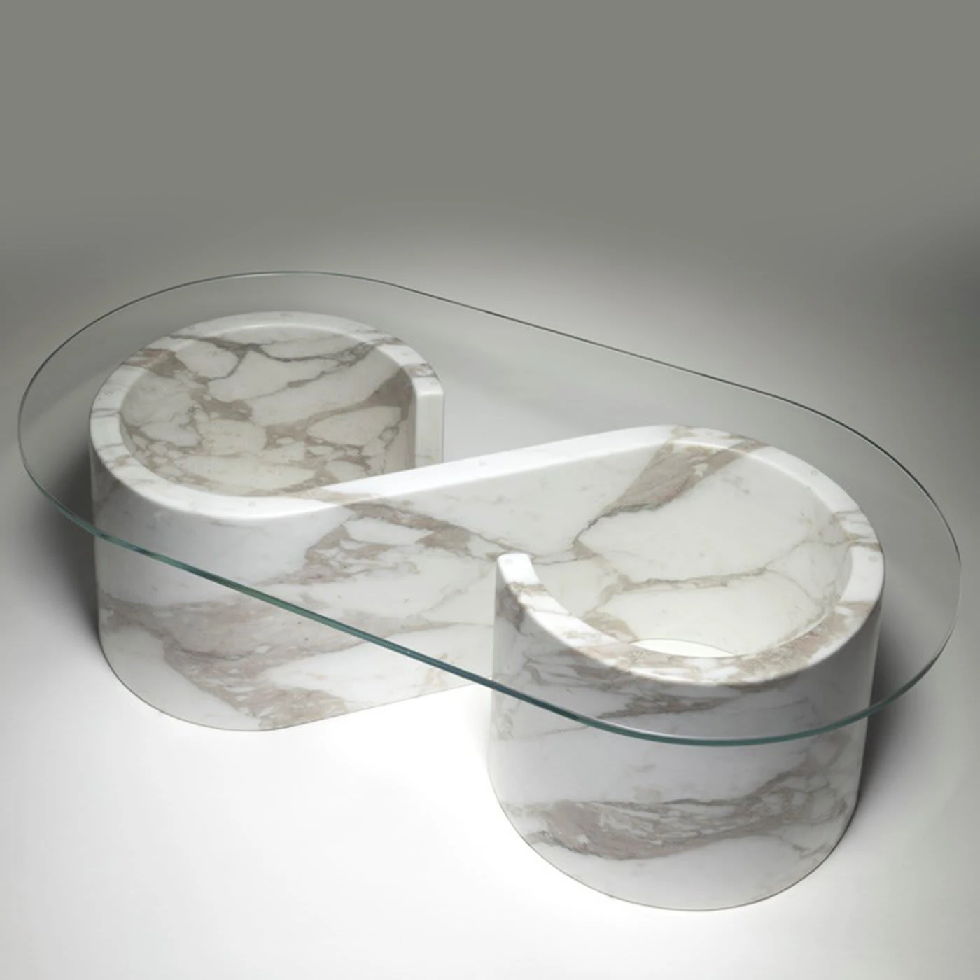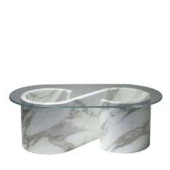 The sinuous lines of this coffee table in white marble and glass makes it almost more a piece of art instead of a piece of furniture! The S-shaped base of the table is crafted from a single block of Calacatta Vagli Oro marble with beautiful, large veins. An oval glass table top completes this piece.