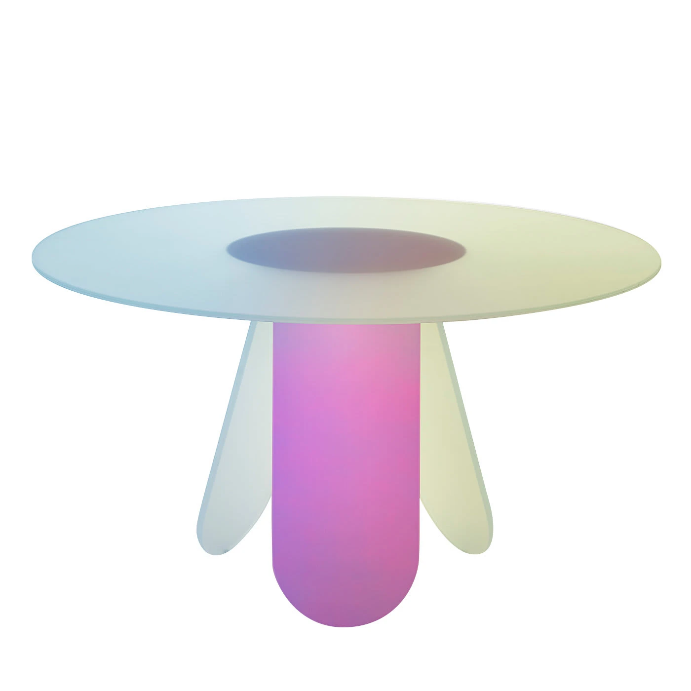 An alluring iridescent finish defines the lively character of this high table made of acid-etched glass. The tripod base consists of rounded panels (disassembly possible) linked to the round tabletop by means of metal plates opportunely concealed thanks to an adorned circular covering.Â