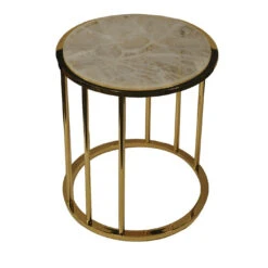 This elegant handmade side table will make a sophisticated addition to a living room or bed room with its minimalist structure in nickel-plated brass with a lustrous gold finish, holding up its round sliced Brazilian hyaline quartz top. This extraordinary stone features striking inclusions and is known to neutralize negative energies and amplify positive ones. The size of the brass base can be customized upon request and it is also available in rose gold, almond gold, rutile, green gold, nickel, and chrome.