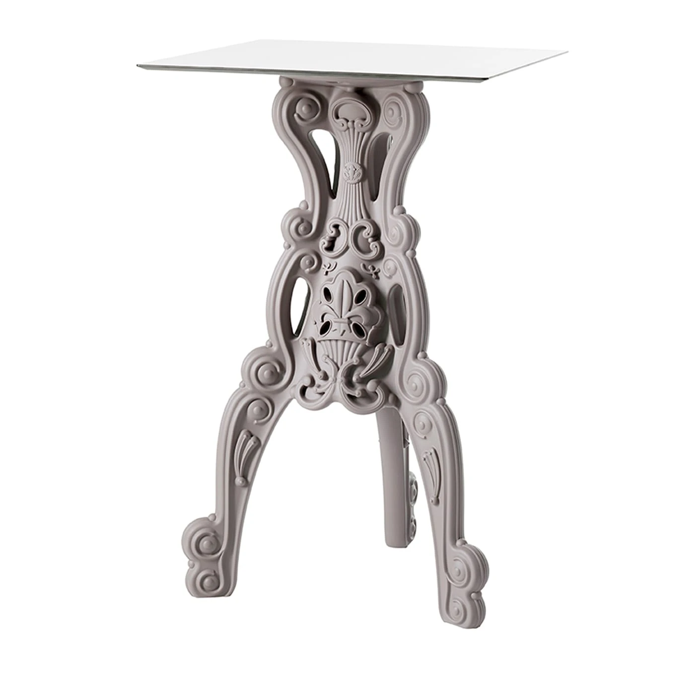 Exclusive design coupling ornate shapes and modern tones, this accent table can be showcased in contemporary homes to accent them with its sober yet eclectic personality. A square, light tabletop rests on the sculptural tripod base in smooth resin, where the fancy curls and details evoke Baroque opulence while reinterpreting it through an elegant monochromatic finish. Other colors and a variant with a round top are available, please check the Artemest catalog.