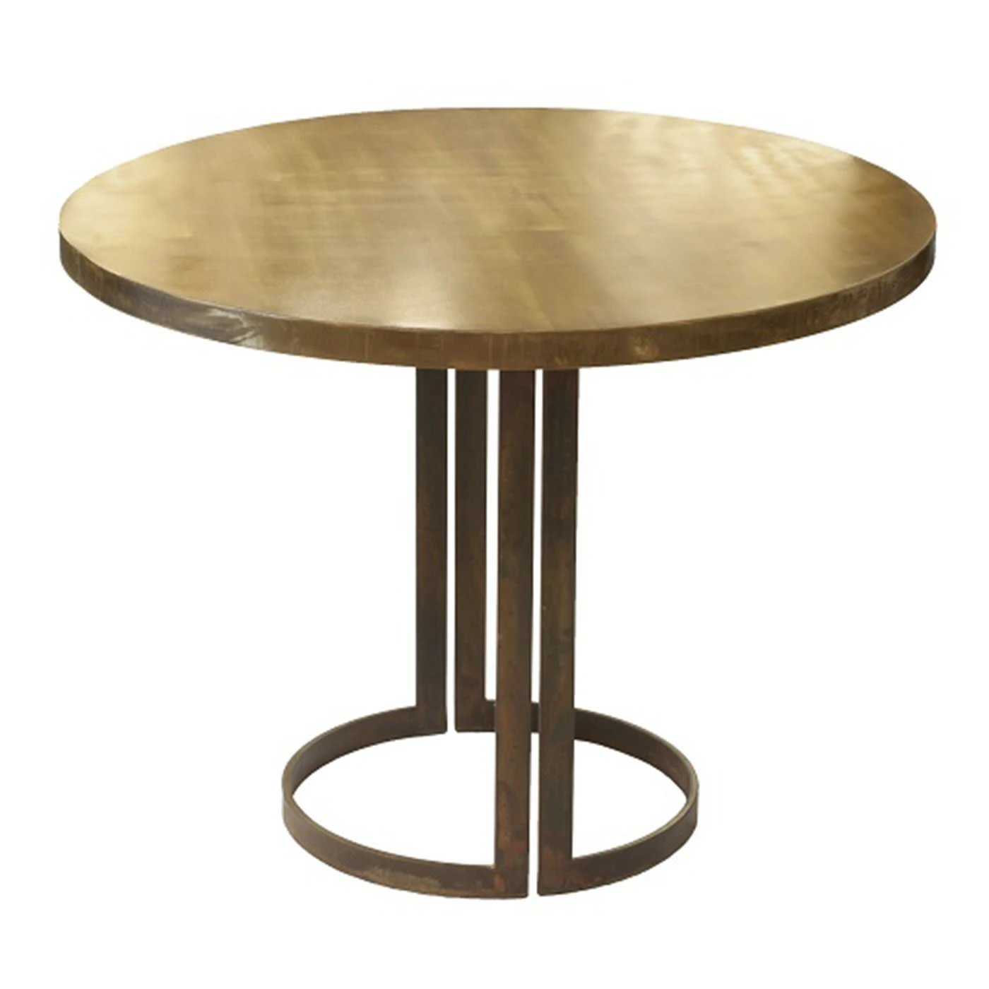 Inspired by the luscious style of Art Deco furniture, this magnificent table is an exercise in minimalism and sophistication. Its central leg is made of oxidized iron 2.8 cm deep and rests on a base that draws a circle on the floor, mirroring the round top, which is made of wood and elegantly covered with a brass sheet 2.8 cm deep that was given an acid-based treatment. The effect is timeless and unique and makes this piece a precious addition to a small dining room, a living room, or an entryway.