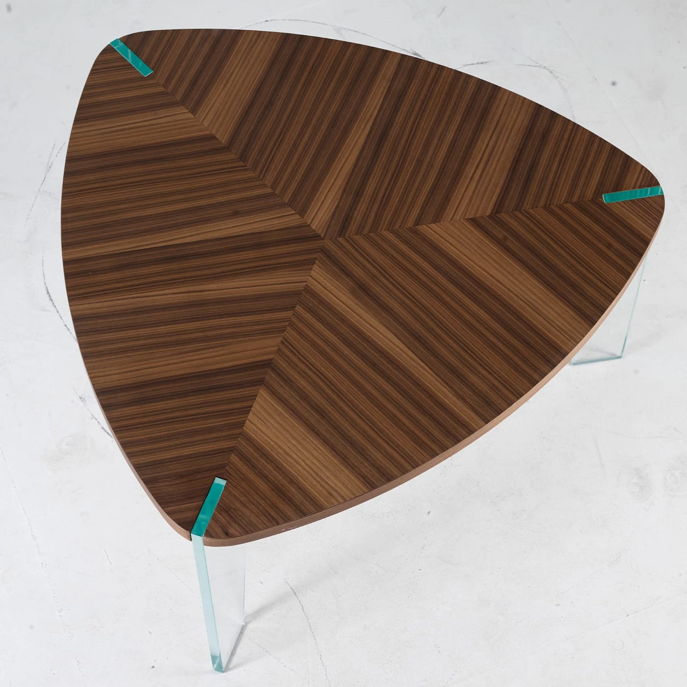 Illusion combines with the substance of traditional solid wood processing. The Sospeso solid wood coffee table is created by the expert hands and vision of our artisans. The linear and formal design of the wooden top worked with inlay technique rests on legs in extra-clear glass with visible joints to convey a floating effect.