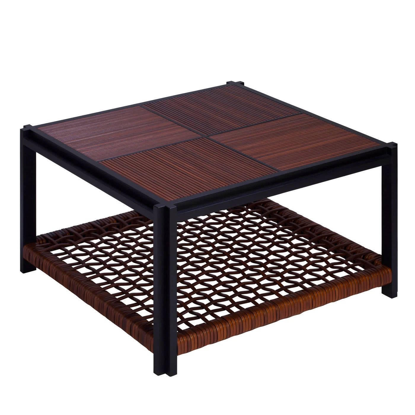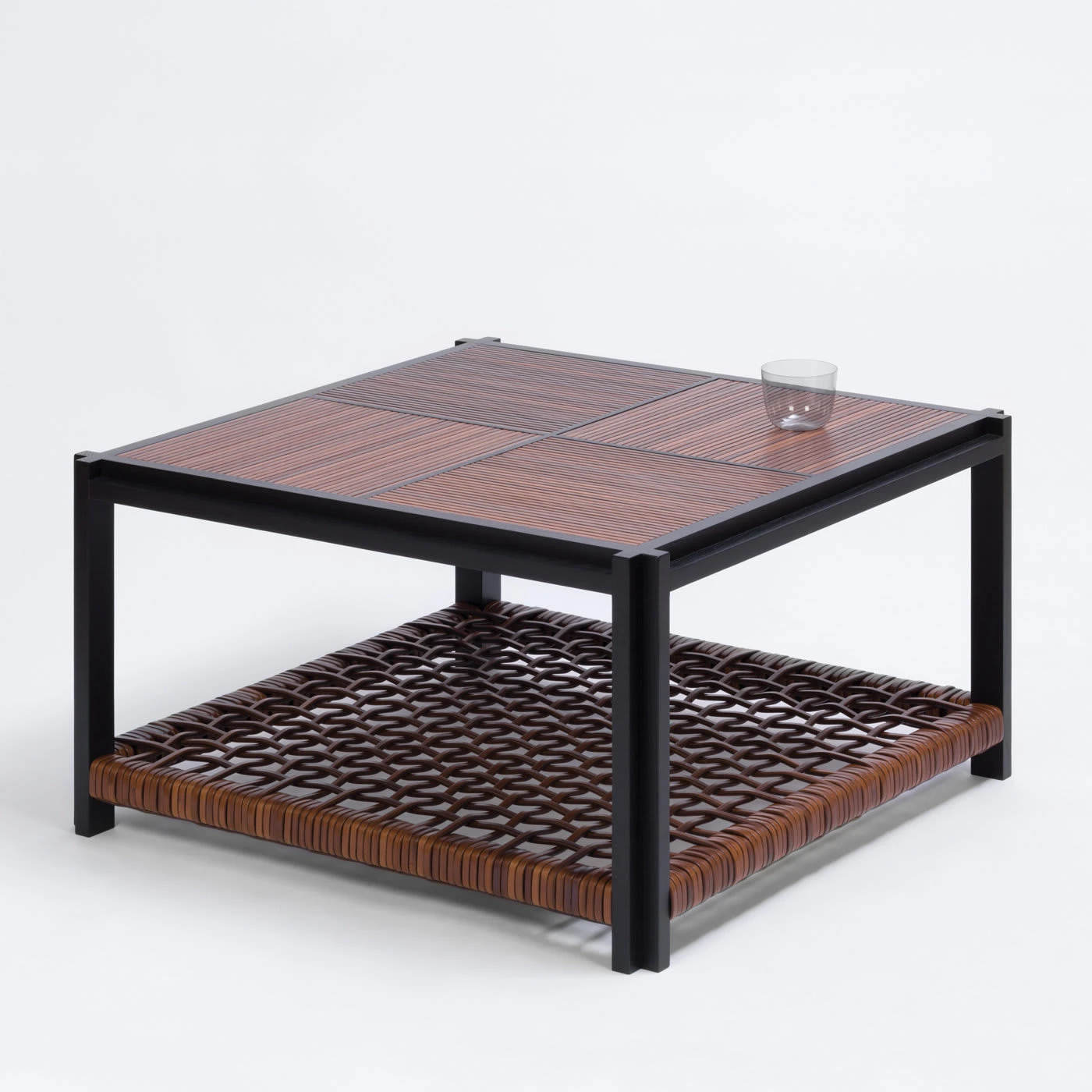 Part of the Structura Collection, this versatile and precious coffee table will splendidly adorn a rustic-chic or contemporary interior, while also providing two shelves to hold and showcase books, plants, lights, or collectibles. The wooden structure with a walnut finish boasts legs in L-shaped cross section supporting bottom and top shelves elegantly made of interlaced brown leather strips. Also available in black leather with wenge-finished structure.