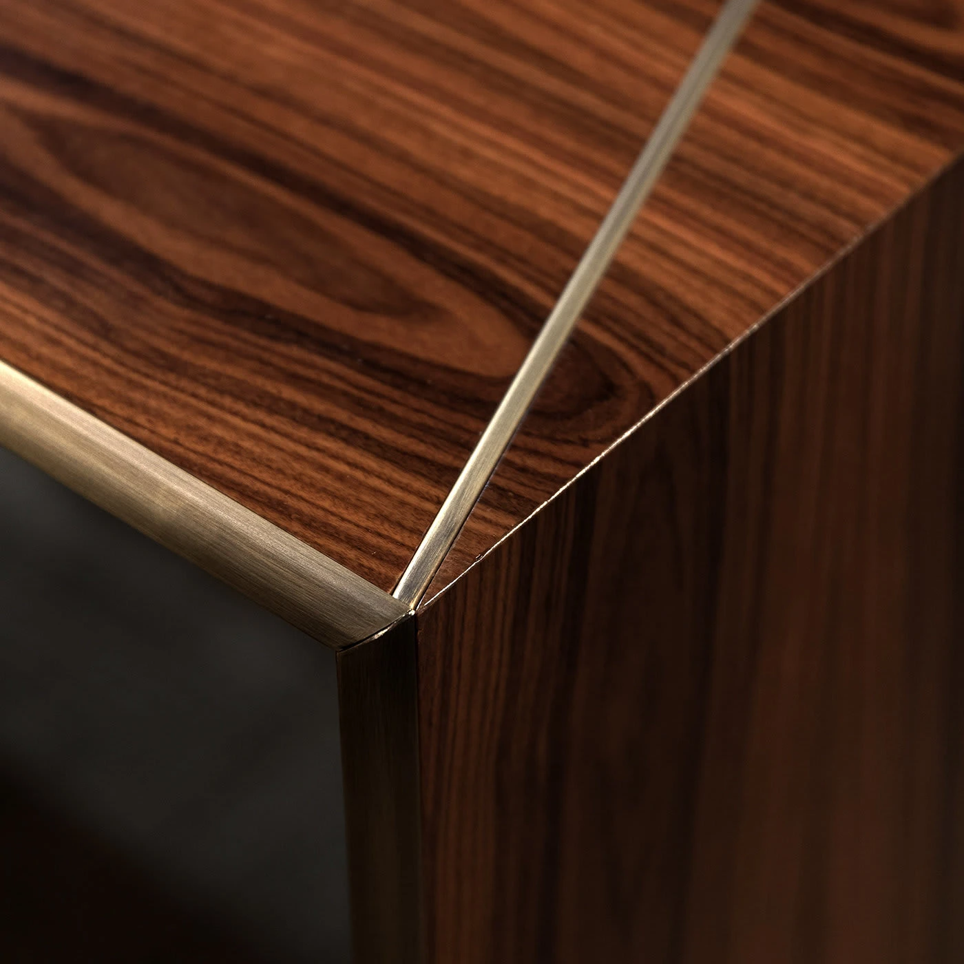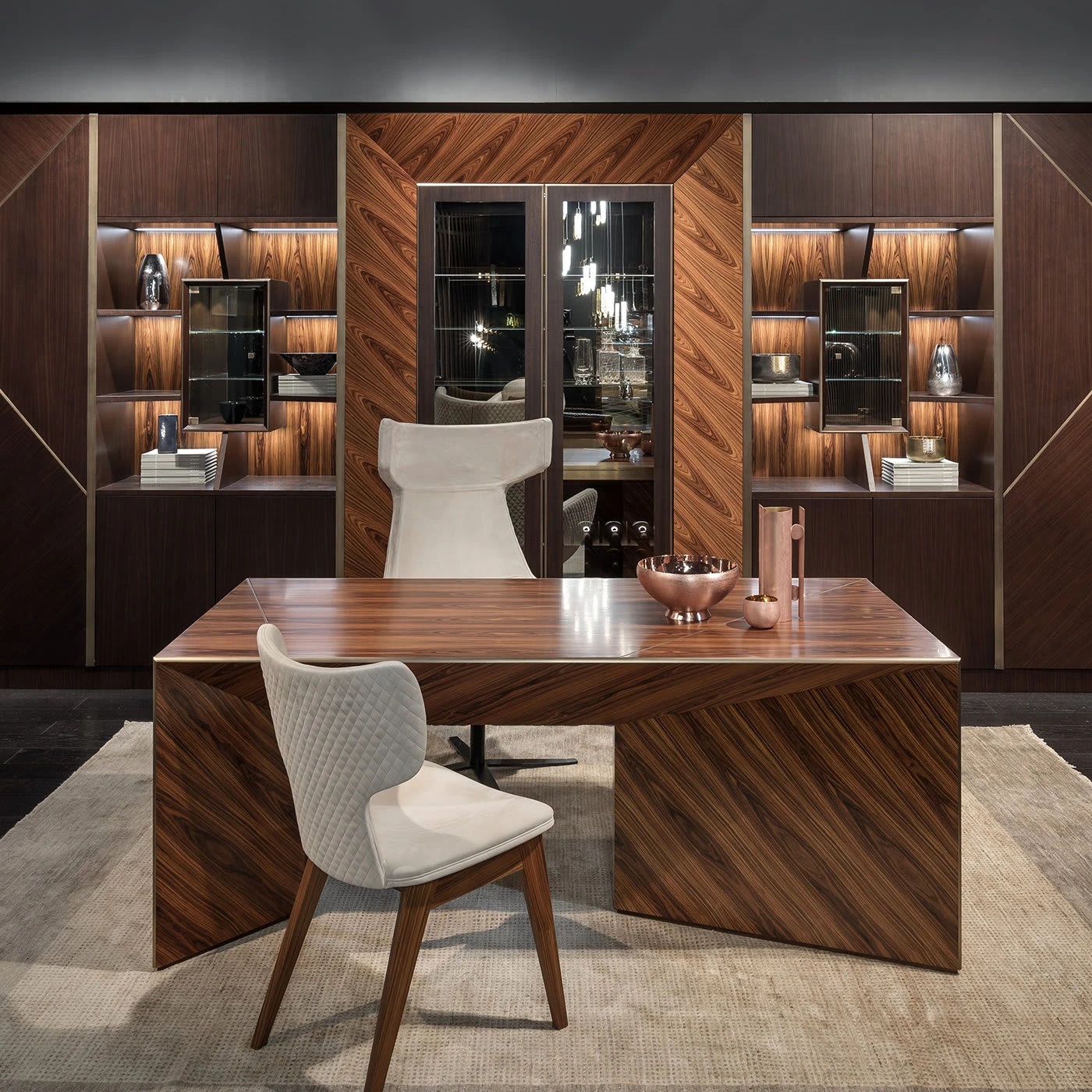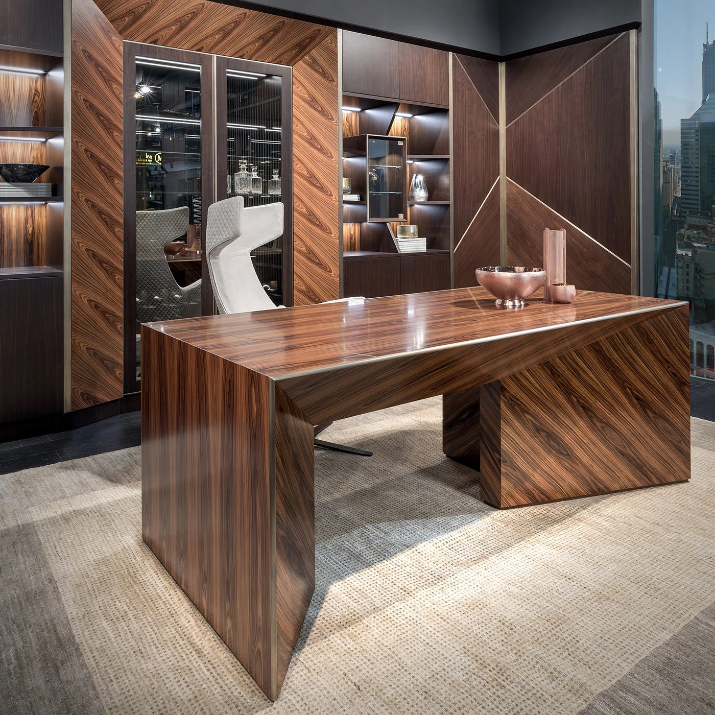 This writing desk is a piece of refined sophistication that will make a statement in any private studio or office. Boasting a sturdy, geometric silhouette with concave angles, this piece is entirely made of wood with a polished finish that enhances its warm hues.
