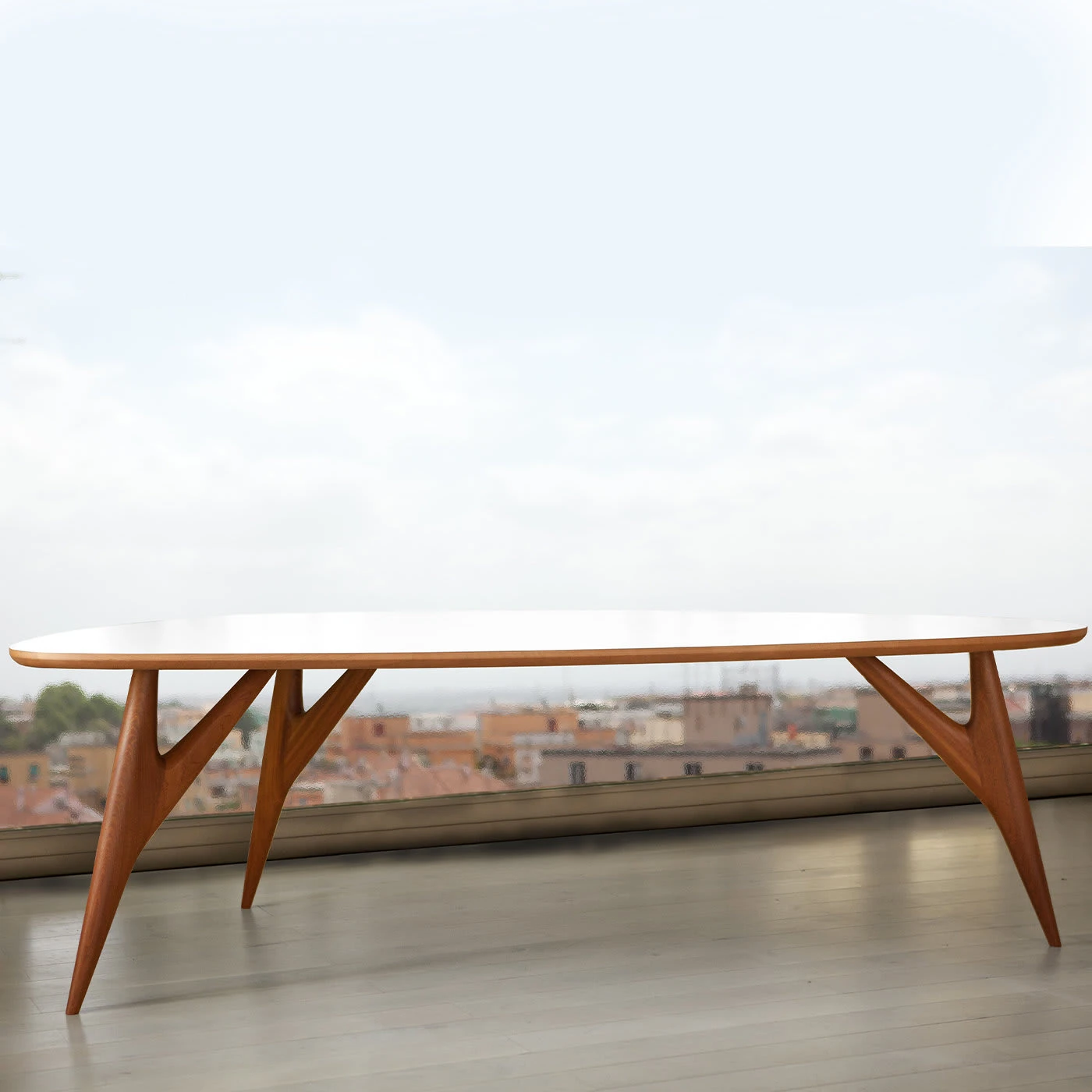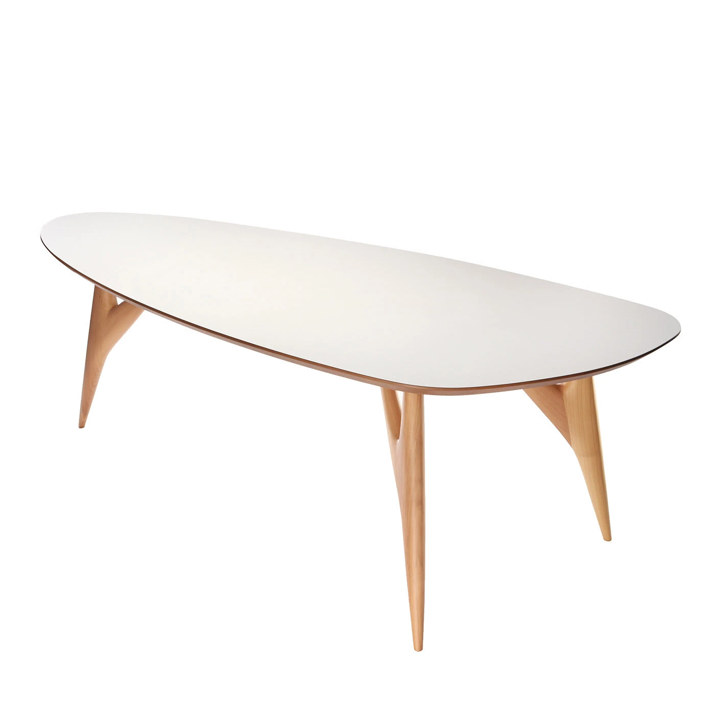 A superb focal point in a modern dining room or in a private study where it can serve as a sleek desk, this wooden dining table displays a fascinating aerodynamic silhouette. The sail-shaped, white-lacquered top adding brightness to the whole is sustained by three tapered legs, marked by a slender and stylized branched design that is entirely unique and handcrafted. Variants measuring 200 and 170cm in width are also available, please ask the Concierge for pricing and details.