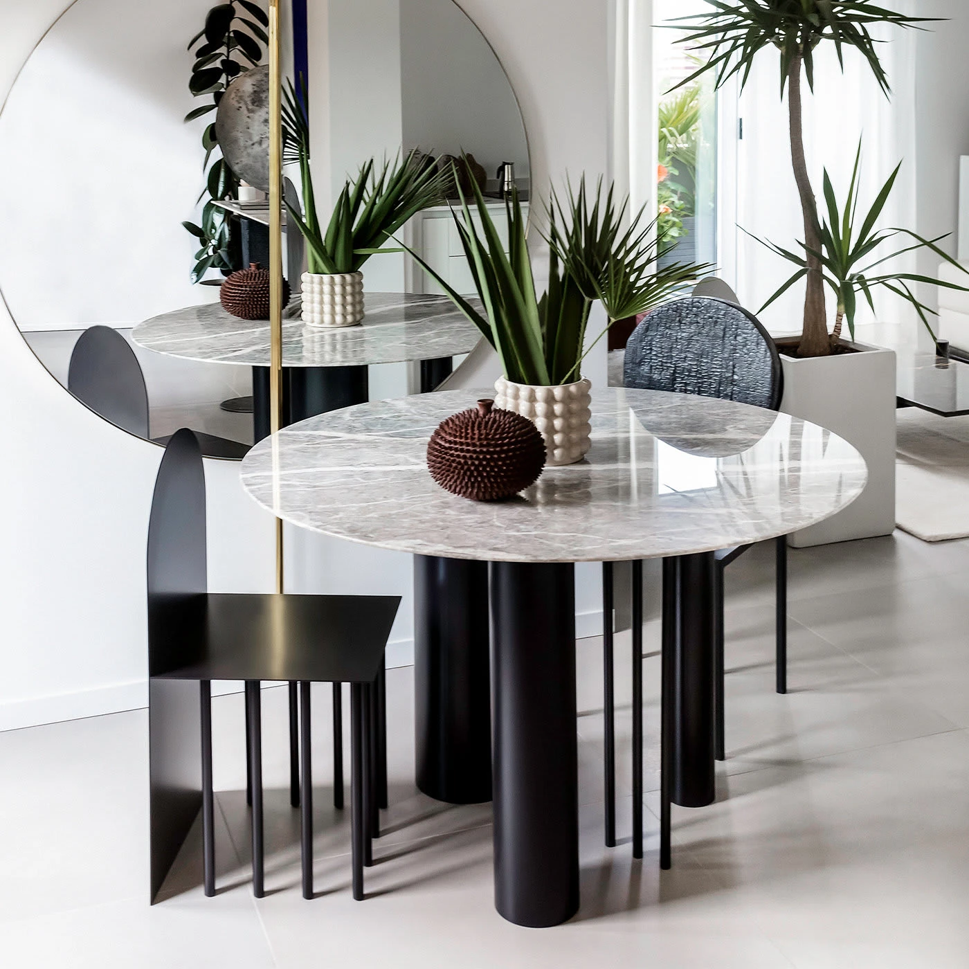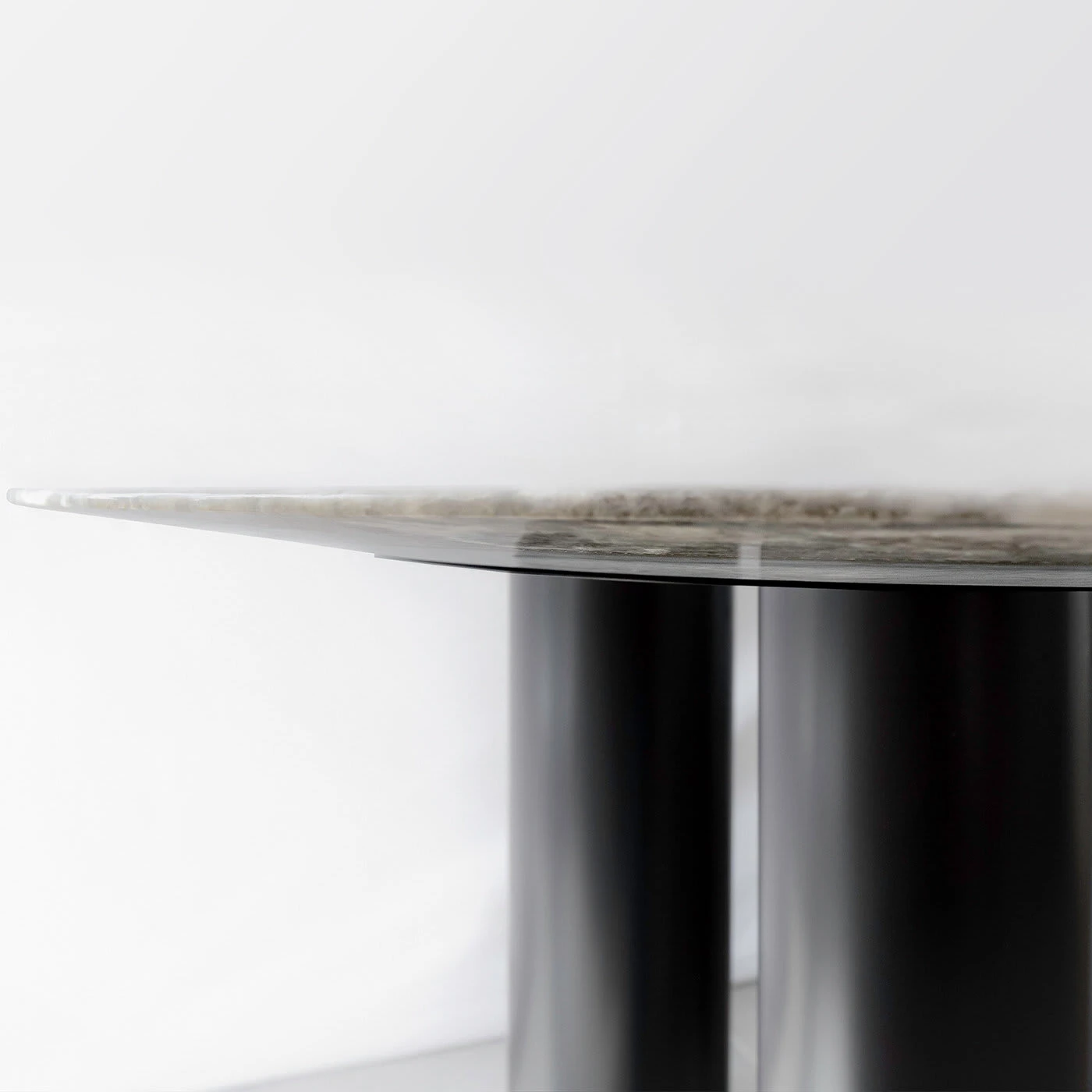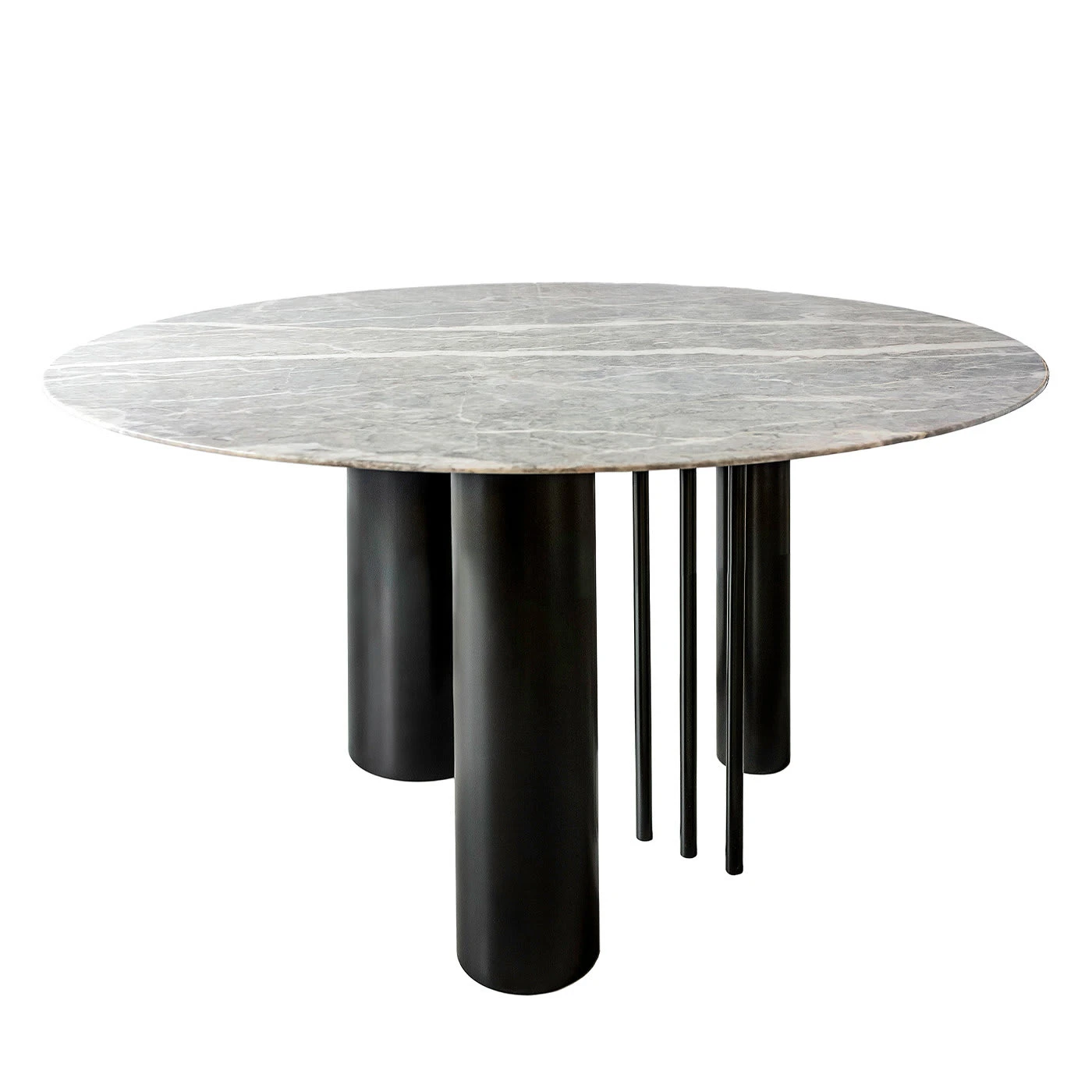 The perfect balance between shapes and materials, this stunning dining table will be an elegant focal point in any contemporary or minimalist home. Resting on a black-lacquered metal composition of three large cylindrical elements juxtaposed to three thin tubes, this refined design is completed with a large and opulent gray marble top, customizable in types of marble upon request to the Concierge.