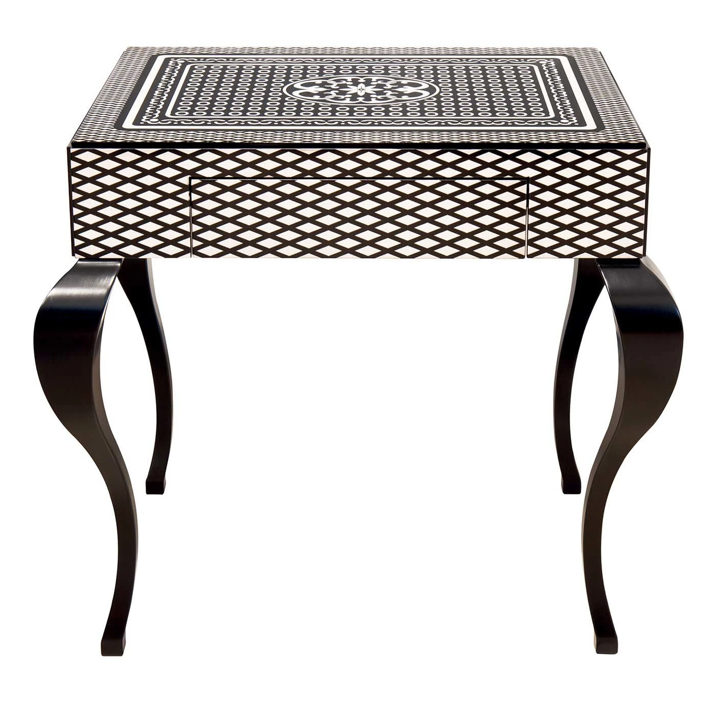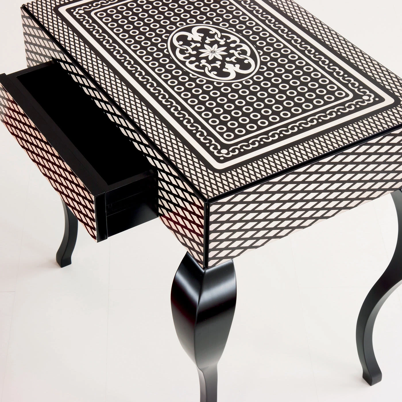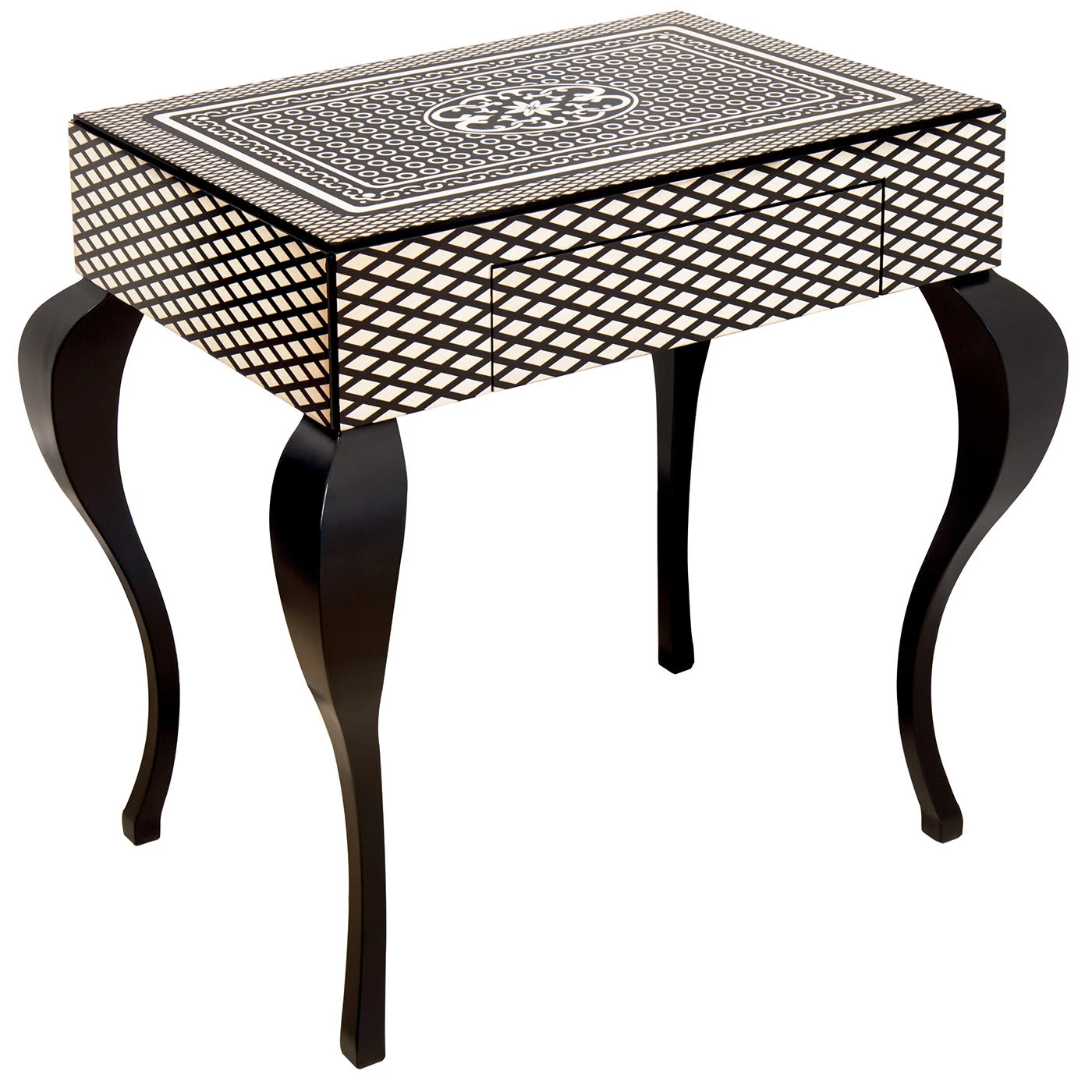 Entirely covered in a diamond-shaped pattern, this splendid side table will make a statement in an eclectic, mid-century-inspired and modern living room or entryway, especially when matched to the console of the same Terramia Collection. Resting on cabriole-style legs of matte black-lacquered Toulipie walnut wood, the MDF top is enriched with a black diamond-shaped pattern over a mother of pearl-lacquered finish that adds a luminous allure to this exquisite and unique piece of functional decor.