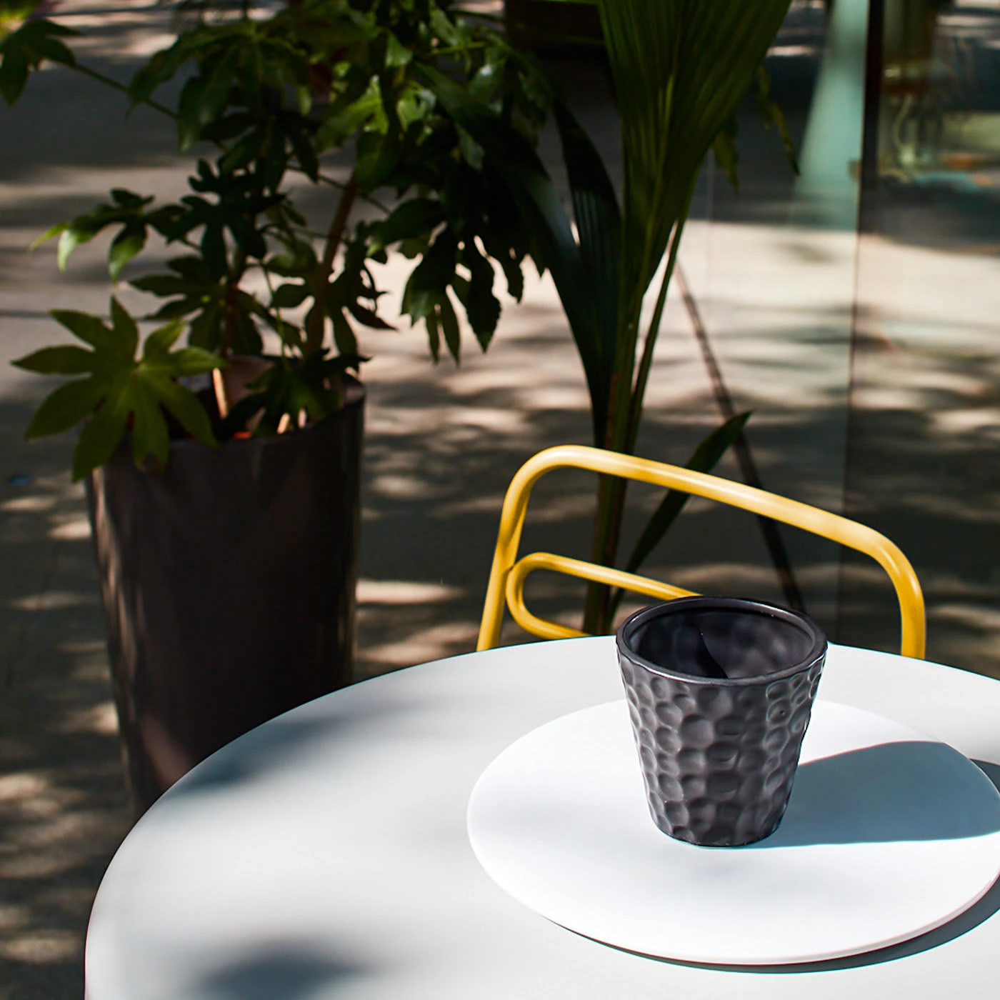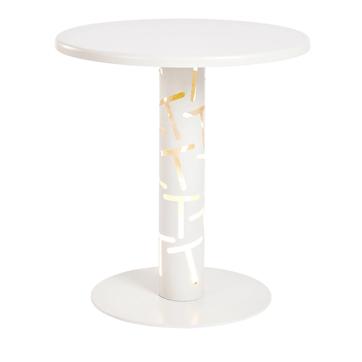 Crafted entirely of metal with a durable, powder-coated white finish, the Thau Table’s exclusive design doubles as light source creating a fascinating effect during evening parties by the pool, in the garden, or on the patio. The round top and base are supported by a pedestal leg whose geometric laser-cut openings house LED bulbs. Available also in a taller variant and customizable in other colors, please contact the Concierge for details.