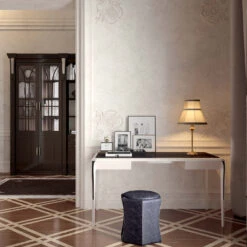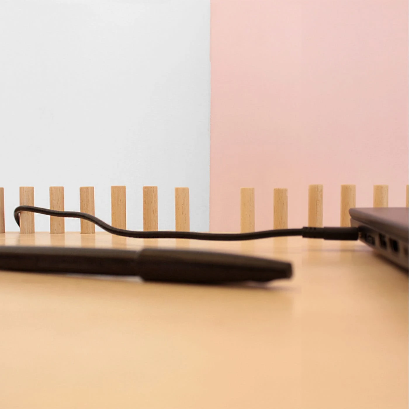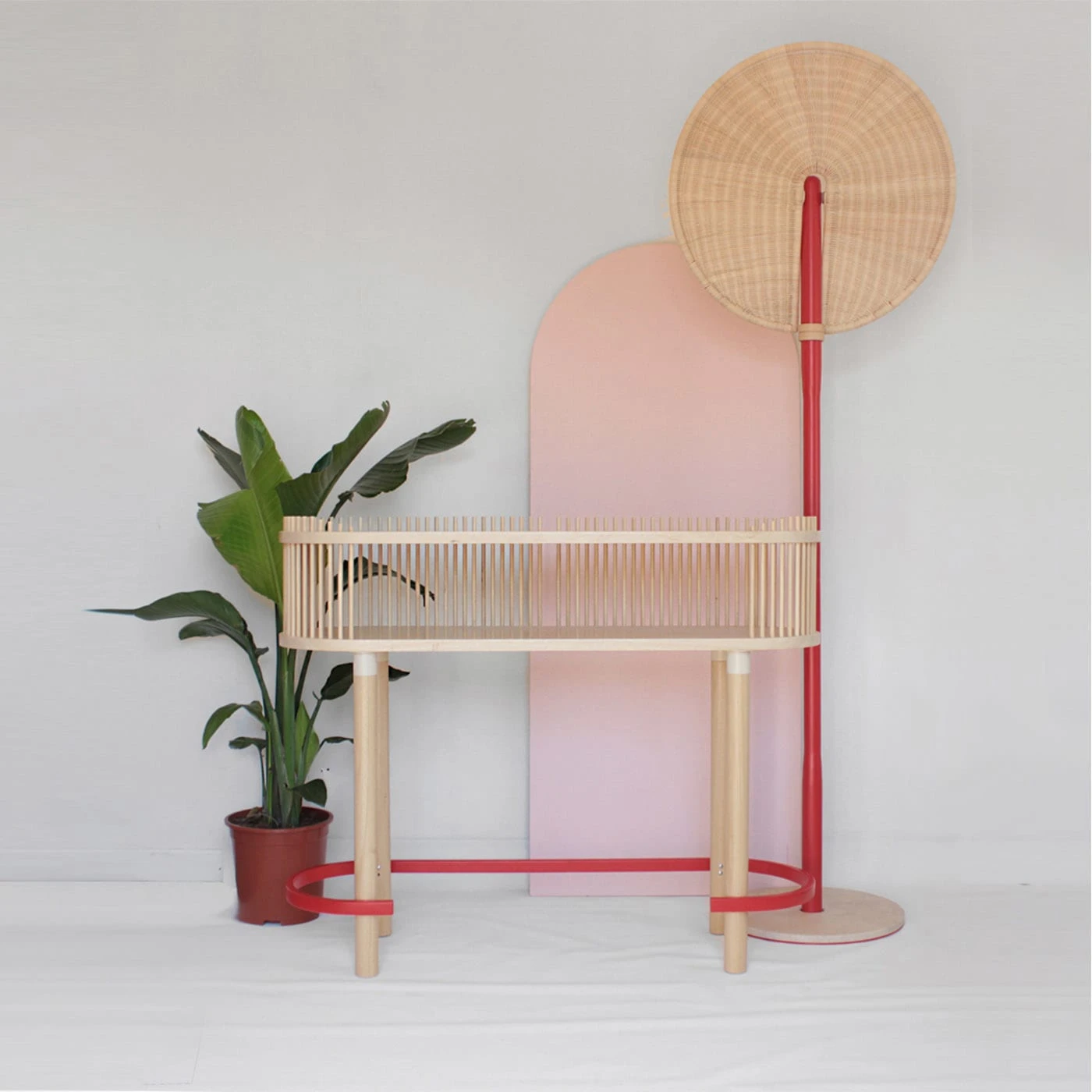 This home office station, named after the Egyptian God protector of Scribes and Writing Art, is the perfect desk for remote working. Equipped with a shelf to store everything at the end of the day, it features 97 wooden rods that define its perimeter, creating a play of shadows and making the table a graceful and airy object that hosts us during the work day, and conceals our office items at night. The space between the rods is suitable for holding the cables of electronic devices.