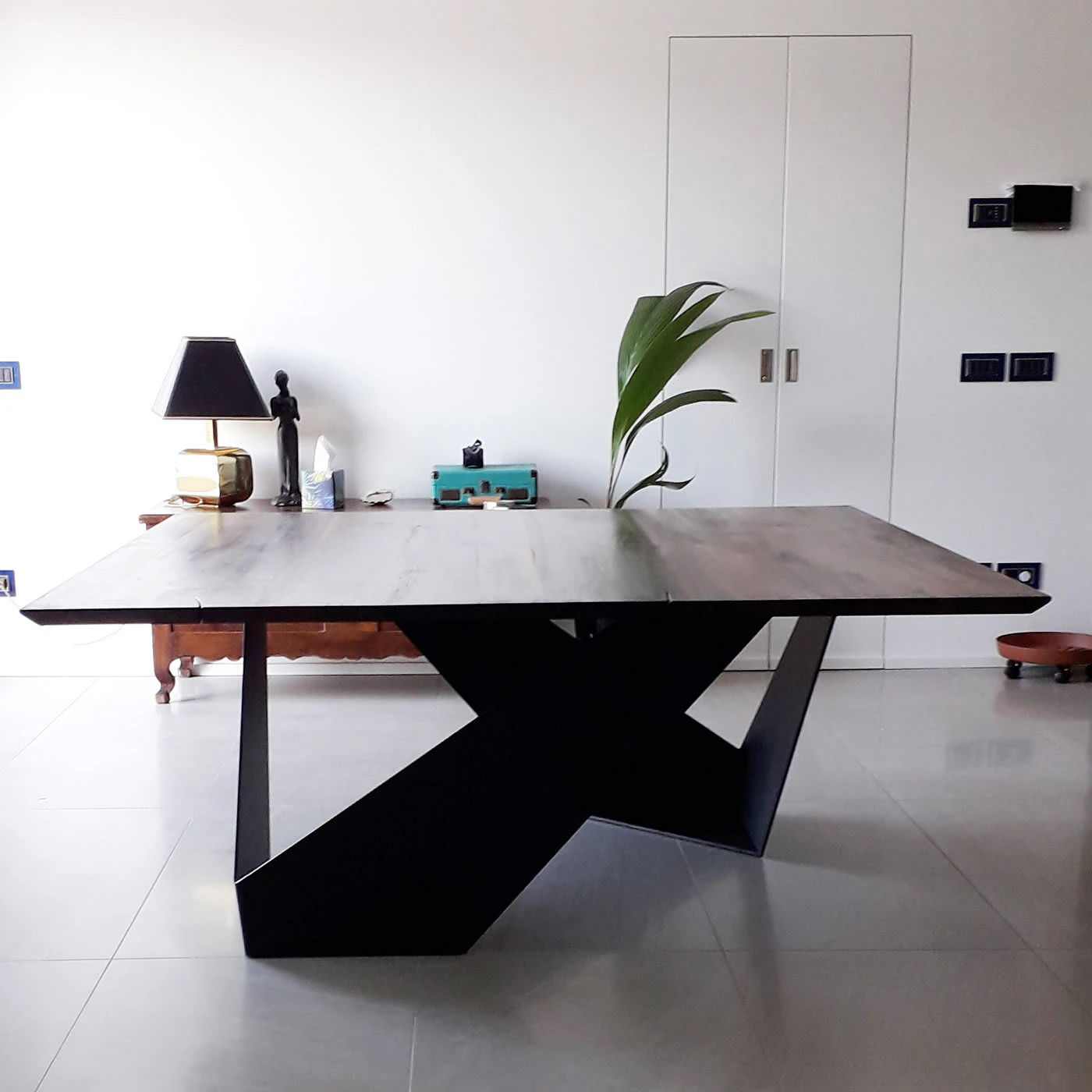 This minimalist table features a geometric silhouette that plays with concepts of space and three-dimensionality, creating a bold, understated style that exudes movement and edge. A solid Canaletto walnut top is perched upon a powder-coated iron base in smoky black. This item can be made to measure. Dimensions 180 cm x 180 cm. Seats 12.