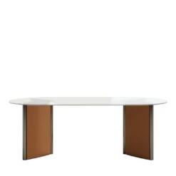 Leather, metal and glass join to create a desk suitable for the office or conference room. Its legs are in extruded aluminum with bronze-painted, rounded edges. It features an extra-clear frosted glass top and MDF base panel covered in cognac-colored leather. Other colors and finishings are available, and the price is quoted upon order.