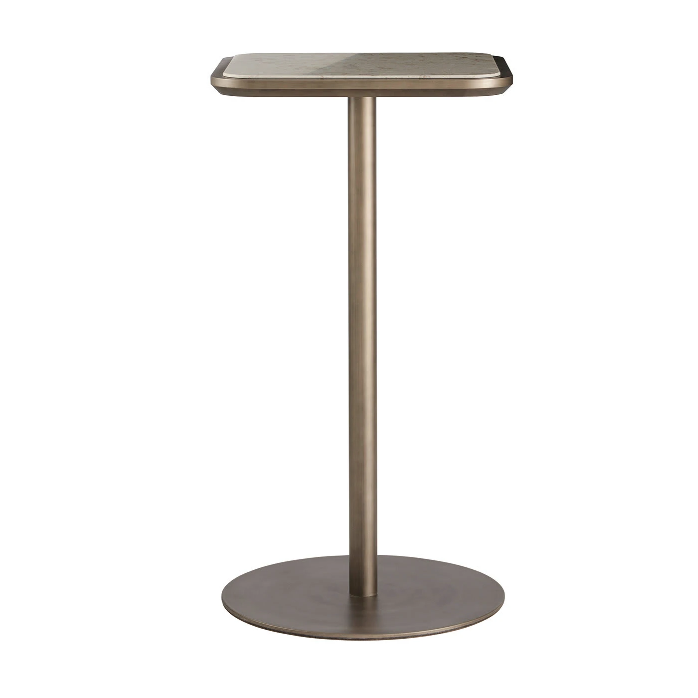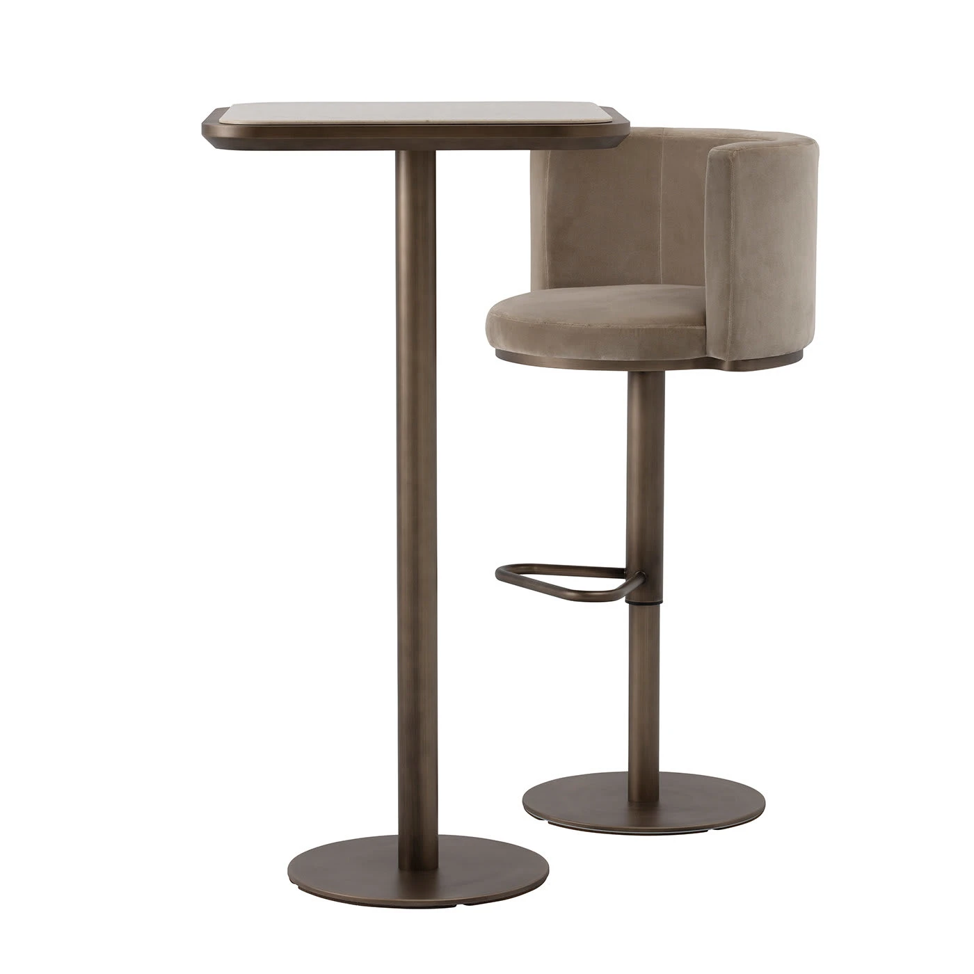 Propped into a lounge area, loft corner, or kitchen, this bar table of the Uno Essential series adds a luxurious touch of uncompromising quality. Featuring a prized Sahara Gold marble round top (mounted on a solid wood supporting panel), the slender and tall iron pedestal base and round foot have a brushed brass finish for a glamorous combination of elegance and industrial design. The simple, compact volumes make it a timeless piece complementing any decor. Nylon glides allow easy movement while protecting hard wood, tile floors, and carpeting. Contract and commercial certifications available upon request.