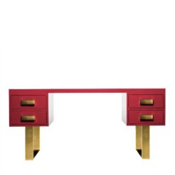 Borrowing inspiration from the silhouette of the mid-century modern desk, this piece is fashioned entirely of aluminum and features a rich coral finish with brass-colored detailing. The old-world aesthetic is captured in the squared frame with side cabinets, each with two drawers and bold rectangular handles. The sleek, U-shaped legs add a retro-modern look that will fit elegantly in any decor. This desk pays tribute to the Italian author Gabriele D’Annunzio and is inspired by his hillside estate on Lake Garda.
