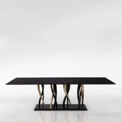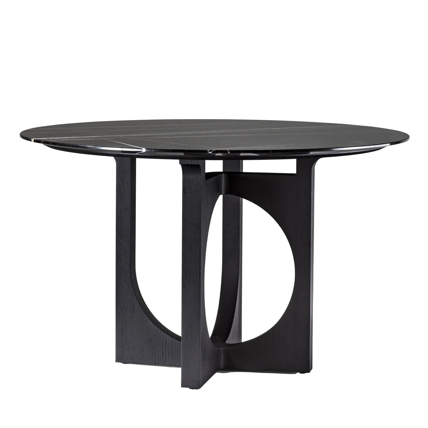 An eye-catching interplay of full and empty shapes, this dining table is a unique piece of design whose asymmetric, the three-dimensional base is fashioned of solid wood and is composed of two engraved panels of captivating contemporary flair. The round top is crafted of marble, adding a sophisticated accent to this remarkable piece.