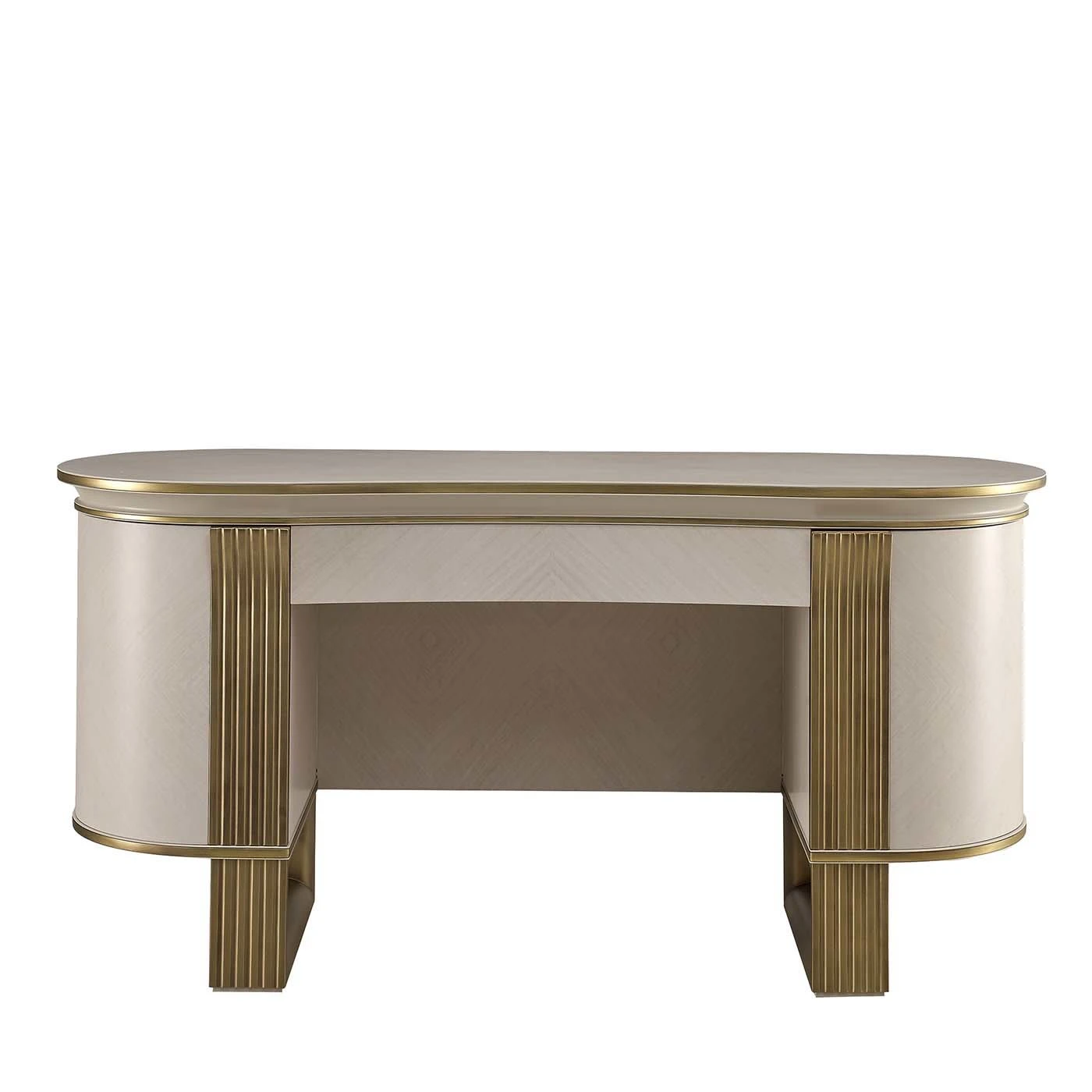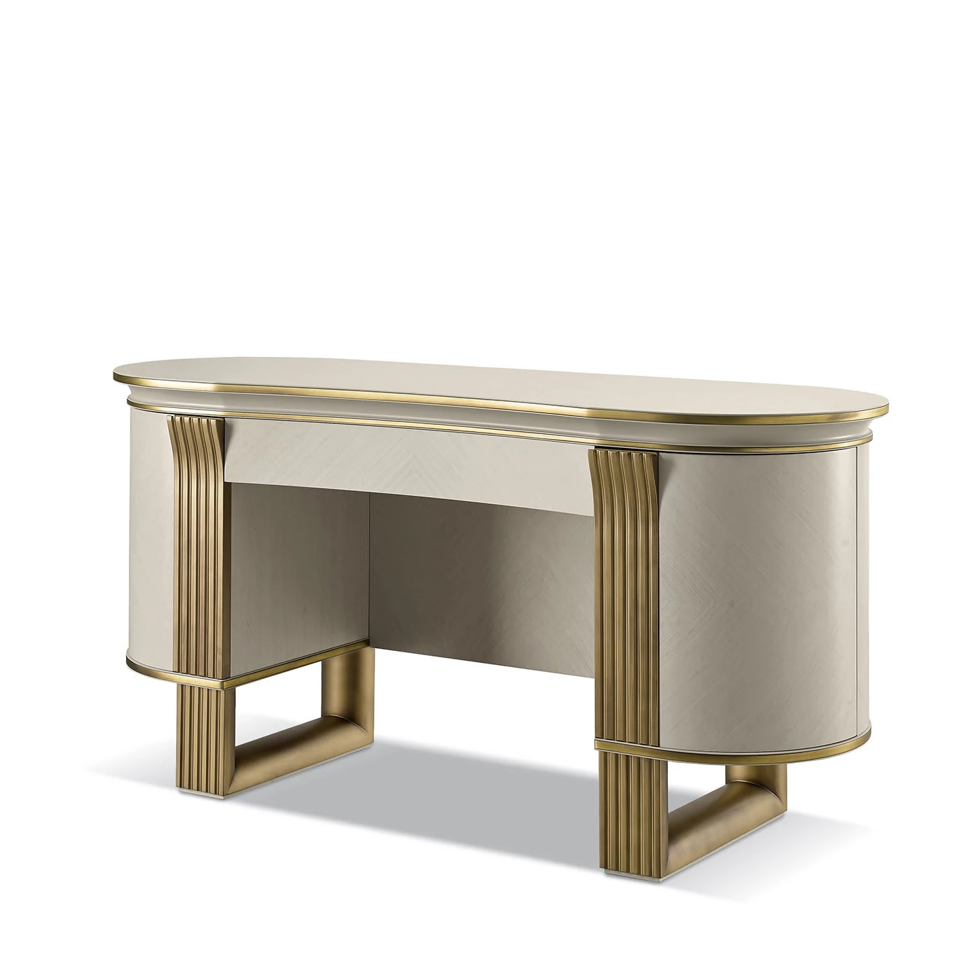 This vanity will be a unique addition to both a classic or mid-century-inspired bedrooms. Exuding elegant and refined allure, the oval-shaped silhouette is crafted of plywood and white eucalyptus-veneered MDF marked with a golden-finished metal profile on the sides that runs vertically to form the squared legs. The front features a hidden drawer with blum closing system.