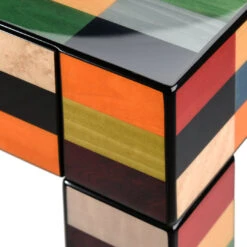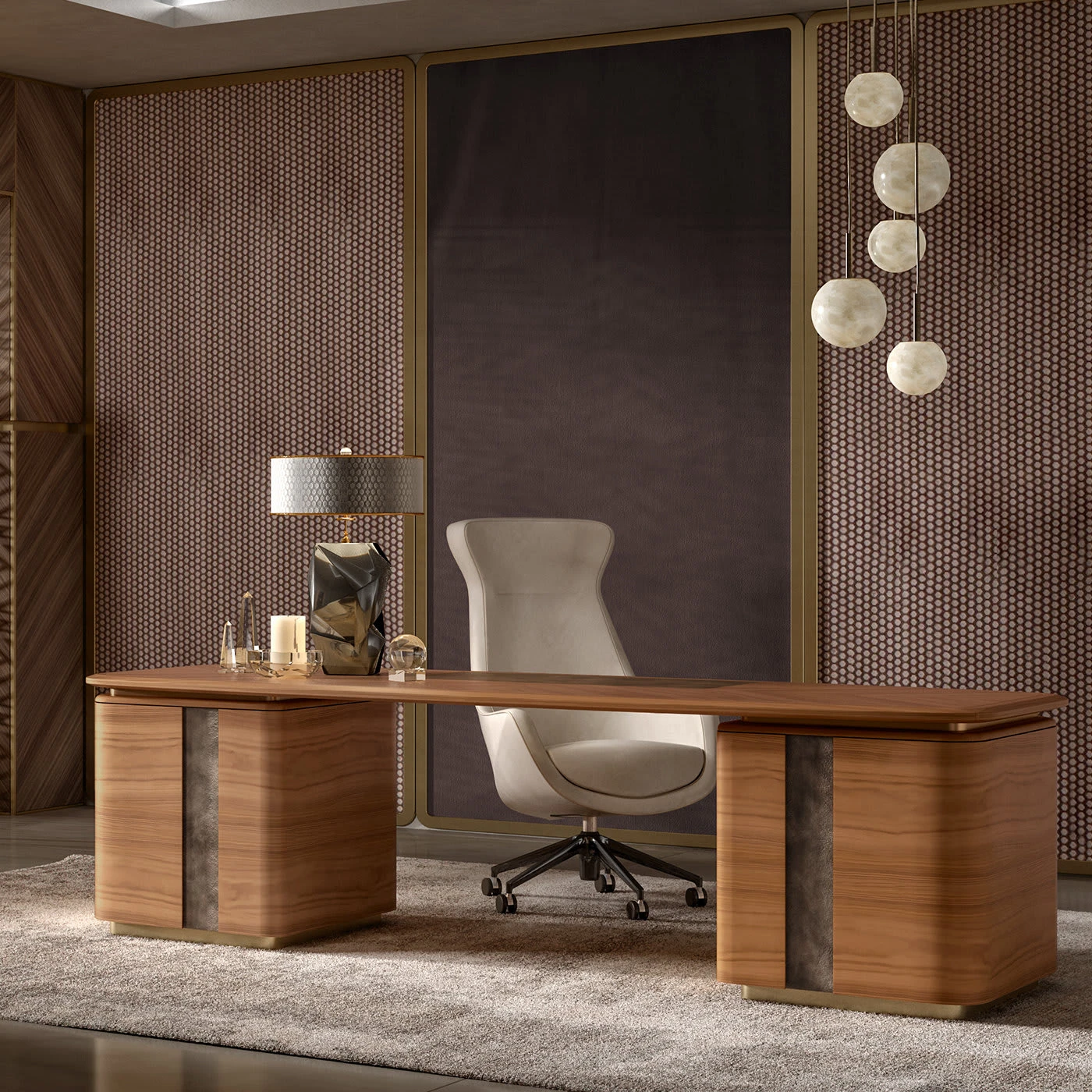 Supported by a wooden frame with a rich Canaletto walnut veneer, this striking two-tone desk will add a luxurious accent to a modern office with its both practical and aesthetically appealing shape. The rectangular top seems to be suspended on the two lateral units that form the supporting base. Each square unit is raised on a metal plinth and features a contoured silhouette with a contrasting mocha-colored leather insert in the center. The hidden drawers are equipped with a soft-close system and lined with soft leather. Available also in India rosewood upon request.
